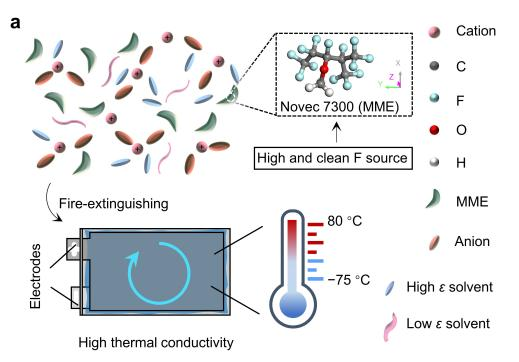 图a 电解液设计策略,Novec 7300引入并与适当的介电常数分散剂成功配位,电解液能够在零下75至零上80摄氏度范围内运行。