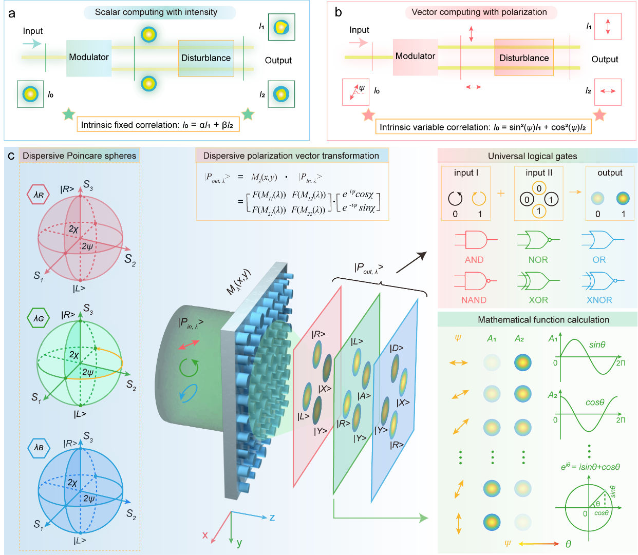 研究团队提出了超构表面矢量模拟运算的光学模拟运算新理念,可以有效克服光学标量运算存在的一系列局限。以偏振作为信息载体的矢量模拟运算,具备较强的抗干扰能力。同时,其输入和输出偏振之间存在变化的映射关系,这使得其能够实现更为复杂的数学模拟运算。基于单层超构表面,研究团队展示了一般化的逻辑门操作,以及三角函数和欧拉公式等复杂数学函数运算。矢量模拟运算分别以偏振矢量和超构表面作为信息和物理载体,有效克服了当今光学模拟计算面临的一系列局限,开启了光学模拟计算新范式。