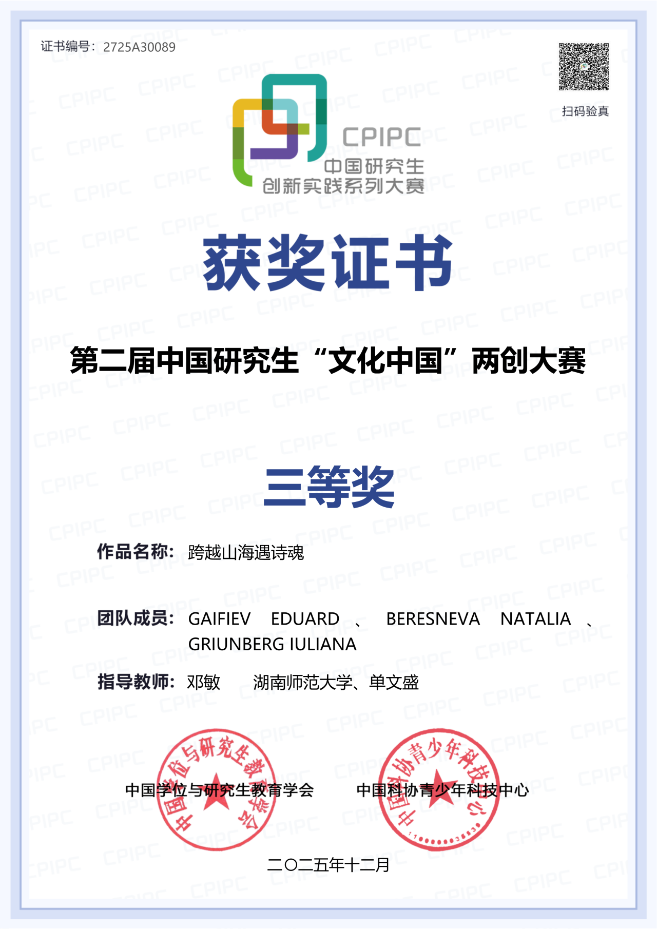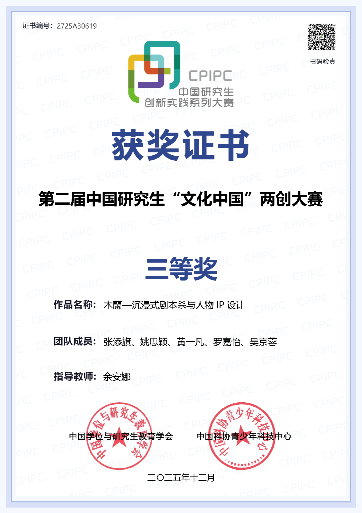第二届中国研究生“文化中国”两创大赛在天津圆满落下帷幕,吸引全国443所高校的5398支队伍参赛,共提交作品4589件。国汉院余安娜老师指导的学生参赛作品《木兰-沉浸式剧本杀与人物IP设计》(团队成员:张添旗、姚思颖、黄一凡、罗嘉怡、吴京蓉)获中国学生组三等奖,作品以沉浸式体验为载体,让木兰“忠孝勇义”精神在趣味互动中实现当代传承。国汉院邓敏老师和新闻与传播学院单文胜老师联合指导的俄罗斯学生参赛作品《跨越山海遇诗魂》(团队成员:GAIFIEV EDUARD、BERESNEVA NATALIA、GRIUNBERG IULIANA)获留学生组三等奖,作品以屈原文化探寻为主线,串联中外诗人精神共鸣,创新中华文化国际传播视角。