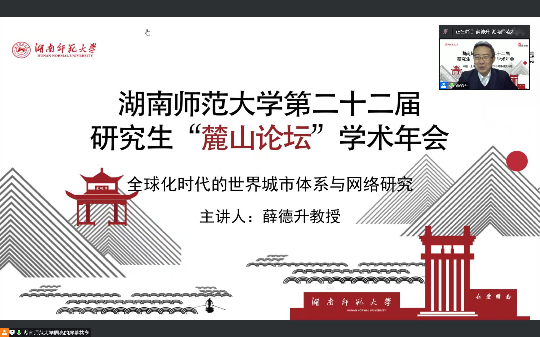 12月1日下午,由研究生院主办,地理科学学院和校研究生团委、研究生会承办的湖南师范大学第二十二届研究生“麓山论坛”学术讲座在线上举行,讲座主题为全球时代的世界城市体系与网络研究。此次讲座的主讲人为中山大学地理科学与规划学院教授、博士生导师、院长、珠江学者特聘教授薛德升,400余位老师、研究生、本科生参与此次讲座,讲座由地理科学学院院长周国华教授主持。